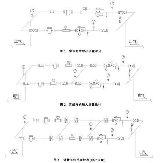 圖1是常規(guī)較小流量的流量計(jì)設(shè)置方案,圖2是常規(guī)較大流量的流量計(jì)設(shè)置方案。按常規(guī)方法設(shè)置流量計(jì)是基于理想流量計(jì)設(shè)計(jì)的,一旦流量計(jì)出現(xiàn)超精度偏差和故障,計(jì)量損失就會發(fā)生,并且無可挽回。雖然設(shè)計(jì)是雙路一開一備。但因無法在工作狀態(tài)下進(jìn)行檢測,所以對新安裝的儀表和工作一段時(shí)間的儀表實(shí)際性能、狀況不能確定。因?yàn)橹灰髁坑?jì)轉(zhuǎn)動,用肉眼是很難看出問題的。除非表停轉(zhuǎn)了或不顯數(shù)。若表停轉(zhuǎn)了或不顯數(shù),管理人員沒有觀察到或者人不在現(xiàn)場,而燃?xì)膺在流動。無計(jì)量現(xiàn)象就發(fā)生(流量計(jì)停止轉(zhuǎn)動不影響燃?xì)饬鲃樱?BR>計(jì)量系統(tǒng)帶監(jiān)控表流量較。500m3/h左右及以下)