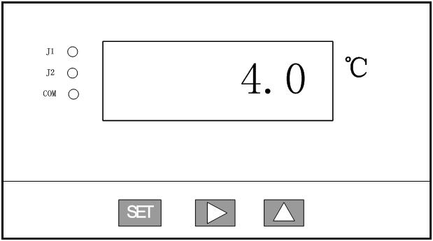 3.按SET鍵進(jìn)入J1釋放值(制冷系統(tǒng)停止值)設(shè)置,按△鍵將溫度值調(diào)至2℃,表示當(dāng)柜內(nèi)溫度低于2℃時,制冷系統(tǒng)停止運行。