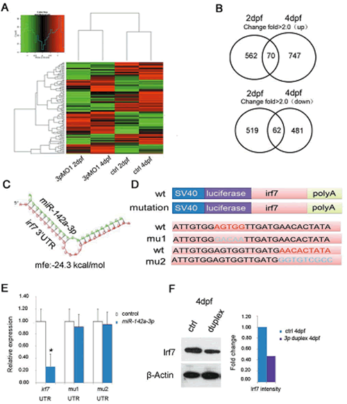 Figure 4 irf7 is a direct target of miR-142a-3p. (A) Heat map analysis of gene expression in controls and miR-142a-3p morphantsat 2 dpf and 4 dpf. (B) Fold changes of upregulated or downregulated genes at 2 dpf and 4 dpf in miR-142a-3p morphants comparedto controls. (C) An imperfect match of irf7 3′ UTR with miR-142a-3p as determined by a calculation using RNAHybrid. (D)Scheme of the PGL3 constructs containing irf7 WT and mutated 3′UTR. (E) Luciferase reporter activity of the reporter containingWT or mutated irf7 3′UTR when co-transfected with the miR-142a-3p duplex into HEK293T cells (mean ± SD, t-test, *P < 0.05, n= 3). (F) Western blotting images showing that irf7 protein level was decreased in duplex-injected embryos at 4 dpf, compared tocontrols (left panel). Quantitative analysis of the western blotting results is shown in right panel.