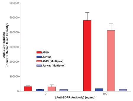 圖4:利用單一A549細(xì)胞和Jurkat,A549細(xì)胞進(jìn)行EGFR結(jié)合實(shí)驗(yàn)的比較。利用單一細(xì)胞群體和混合細(xì)胞對(duì)結(jié)合實(shí)驗(yàn)沒(méi)有明顯的差異。