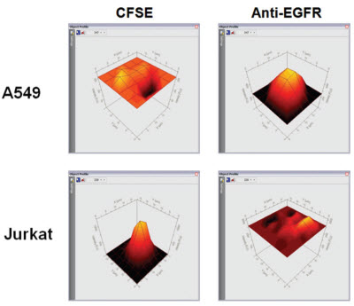 mirrorball所獨(dú)有的多種激光同時(shí)掃描特征可以在轉(zhuǎn)染和宿主混合細(xì)胞中區(qū)分出抗原表達(dá)和未表達(dá)的細(xì)胞群體。為了闡明該方面的特性,在A549(EGFR+)和CSFE標(biāo)記的Jurkat (EGFR-)進(jìn)行EGFR抗體的結(jié)合篩選實(shí)驗(yàn)。在分析之前,將Jurkat細(xì)胞進(jìn)行CSFE(10nM)的染色。圖3顯示了A549和Jurkat細(xì)胞在100ng/ml抗體的結(jié)合條件下的3D熒光強(qiáng)度圖譜,可以看到EGFR抗體特異性結(jié)合到A549細(xì)胞,在Jurkat細(xì)胞未檢測(cè)EGFR抗體的結(jié)合。
