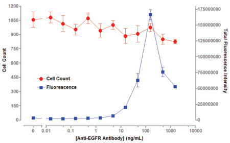 圖2:A549細(xì)胞總熒光強(qiáng)度隨著EGFR濃度增加而加強(qiáng),細(xì)胞計(jì)數(shù)可單獨(dú)讀取。