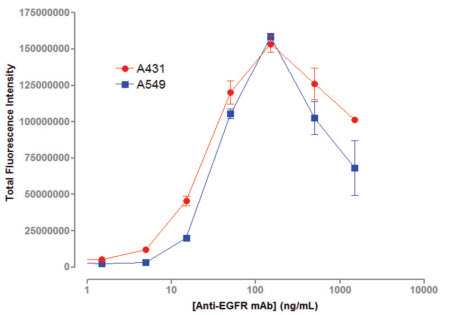 圖1. A431/A549上的總熒光強(qiáng)度隨抗EGFR抗體濃度增加而加強(qiáng)。