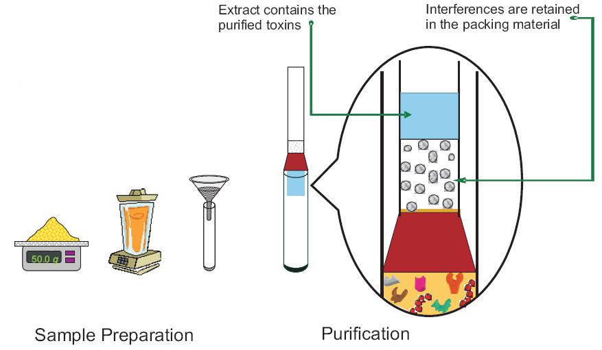PriboFast® 228多功能凈化柱采取將極性、非極性及離子交換等多類基團作為填充劑填充到柱體中,可選擇性吸附樣液中的脂類、蛋白類等雜質(zhì),從而對毒素樣品起到非常針對性的純化作用。其顯著特點是,一步就可完成毒素樣品的凈化(操作步驟見下圖),30秒左右即完成整個凈化過程,凈化效果理想, 實驗證明,對谷物樣品PriboFast系列凈化柱比免疫親和柱回收率還要高,其對所有真菌毒素的回收率均在85-95%; 之二是操作步驟更為簡便,凈化前也不需進行活化、淋洗和洗脫等操作只需直接上樣,有效減少有機溶劑的使用和浪費;其操作明顯不同于免疫親和柱和固相萃取柱(E),后兩者凈化樣品至少需要三步 1)將樣品中的待測物吸附到柱上;2)清洗柱上的雜質(zhì);3)用有機溶劑洗脫柱子上的待測物。