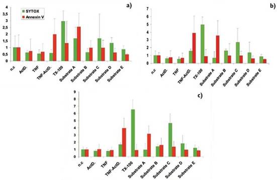 Vybrant細(xì)胞凋亡檢測(cè)試劑盒是基于Annexin V和Sytox Green兩種標(biāo)記物的基礎(chǔ)上開發(fā)出的,可以快速和簡(jiǎn)便的區(qū)分腫瘤細(xì)胞的凋亡和壞死情況。Annexin V是一種人類血管抗凝劑,標(biāo)記藻紅蛋白(R-PE)后通常用來檢測(cè)凋亡細(xì)胞的發(fā)生。其工作原理是正常細(xì)胞中,磷脂酰絲氨酸只分布在細(xì)胞膜脂質(zhì)雙分子層的內(nèi)側(cè),當(dāng)細(xì)胞發(fā)生凋亡早期,膜磷脂酰絲氨酸(PS)由脂膜內(nèi)側(cè)翻向外側(cè),Annexin V是一種磷脂結(jié)合蛋白,與磷脂酰絲氨酸具有高度的親和力。相反,Sytox Green染料不能滲透進(jìn)入活細(xì)胞和凋亡細(xì)胞,但可以進(jìn)入壞死細(xì)胞并對(duì)其細(xì)胞核進(jìn)行染色,發(fā)出很強(qiáng)的綠色熒光。我們提前將腫瘤細(xì)胞種在384孔板中,然后分別使用腫瘤壞死因子(TNF)和放線菌素D(Actinomycin-D)來誘導(dǎo)細(xì)胞凋亡,使用聚乙二醇辛基苯基醚(Triton X-100)誘導(dǎo)細(xì)胞壞死。此外,我們可通過檢測(cè)細(xì)胞組織表達(dá)的不同物質(zhì)的抗腫瘤特性和分化特性來區(qū)分細(xì)胞凋亡和細(xì)胞壞死。