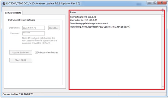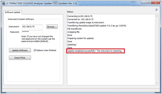 4、 點(diǎn)擊Update Software,勾選后面的Reboot when finished,彈出警告界面,確認(rèn)后軟件自動(dòng)開(kāi)始升級(jí),右面Status處會(huì)顯示升級(jí)進(jìn)度和結(jié)果,升級(jí)完成后顯示successful,其間儀器會(huì)自動(dòng)重啟;