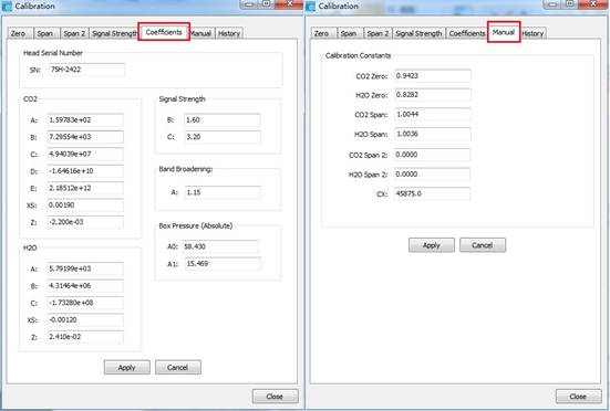 2、 LI-7500A或LI-7200系統(tǒng)通電,運(yùn)行之前版本的應(yīng)用軟件建立連接,備份產(chǎn)品參數(shù)。主要備份Calibration下的Coefficients和Manual數(shù)據(jù)。此外可以備份之前的站點(diǎn)信息,以防升級(jí)后丟失這些關(guān)鍵參數(shù);