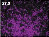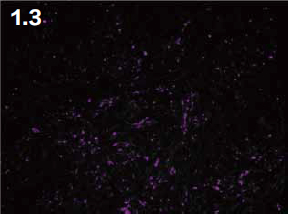 左側(cè)的圖像顯示熒光VCAM-1表達(dá)的細(xì)胞,右圖加上紫色遮罩,顯示軟件對表達(dá)炎癥標(biāo)簽蛋白的劃分;高劑量的抗炎化合物SB202處理的細(xì)胞(上排)顯示出很少的VCAM-1的表達(dá),而低劑量的抗炎化合物SB202處理的細(xì)胞(下排)使用細(xì)胞因子后,則表達(dá)出大量的VCAM-1。所有的值為經(jīng)過歸一化處理后的總強(qiáng)度值。
