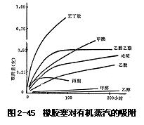 頂空容器用橡膠塞封口時應(yīng)特別注意,有可能造成誤差,使分析結(jié)果的準(zhǔn)確性和重現(xiàn)性受到影響。麥爾(Maier)在分析產(chǎn)生香味的固體物質(zhì)時,發(fā)現(xiàn)橡膠塞吸附了大量欲分析的組分。他認(rèn)為,此吸附作用即使把塞子加熱,或改用鋁箔或聚四氟乙烯薄膜都無法避免,改用銀制帽子也不一定能給出滿意的結(jié)果。因此,分析固體樣品時,最好先測出空白試驗值。做液體樣品的頂空分析時,則觀察不出氣相中組分濃度的減少,這可能是它們從液相中能迅速揮發(fā)出來的緣故。圖2-45表示吸附在橡膠塞中各種組分蒸汽的量與時間的函數(shù)關(guān)系。