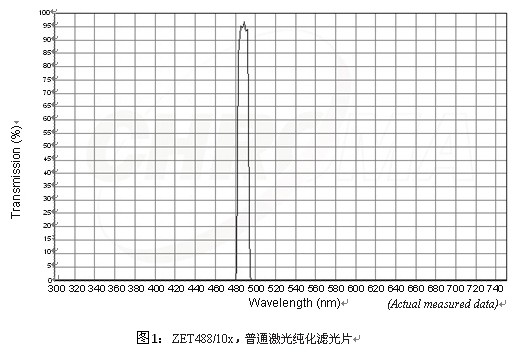 在激光的應(yīng)用中,大多數(shù)濾鏡的規(guī)格要求有明顯不同。純化濾光片(用于激光的激發(fā)片)必須僅對(duì)來自激光的不需要的波段有過濾作用,F(xiàn)在還有很多用戶認(rèn)為激光不需要純化濾光片,這不是正確的。幾乎所有的等離子體激光器會(huì)產(chǎn)生多條不同功率的譜線,并且新一代的二極管發(fā)射譜具有更寬的半峰全寬。此外,它們也可能會(huì)有遠(yuǎn)離主要譜線的噪聲。二極管泵浦固態(tài)激光器在它們的輸出中通常會(huì)有非常窄發(fā)射譜,但是它有可能被泵浦源或主要譜線所污染。由于這些原因,所有的激光系統(tǒng)都要進(jìn)行有或沒有純化濾光片時(shí)的信噪比檢測(cè)。透射波陣面必須優(yōu)于每英寸一個(gè)波,盡管有些應(yīng)用中的要求是每英寸1/4個(gè)波或者更好。楔必須小,一個(gè)弧分以內(nèi),且沒有針孔。必須事先考慮到樣品的自發(fā)熒光,并且必須劃痕/戳的規(guī)格不低于60/40。這些濾鏡通常具有10-20納米的半峰全寬,是經(jīng)打磨和拋光過的,并且在任一面都是增透鍍膜,而不是干涉鍍膜。盡管標(biāo)準(zhǔn)的激光應(yīng)用使用浮法玻璃作為基片效果非常好,拉曼技術(shù)以及其它的應(yīng)用可能需要用熔融石英玻璃來消減光路中可能存在的任何自發(fā)熒光的。純化濾光片被設(shè)計(jì)成適合于3-5度的入射角以確保反射的激光不會(huì)回到激光震蕩腔中。如下圖1。
