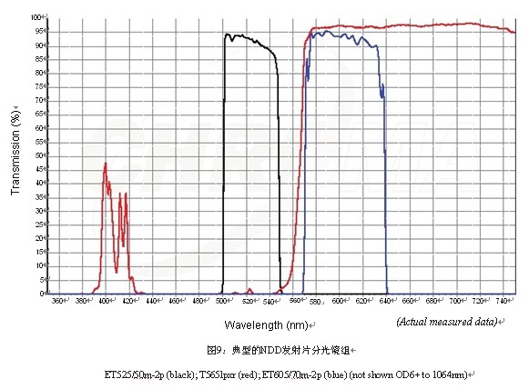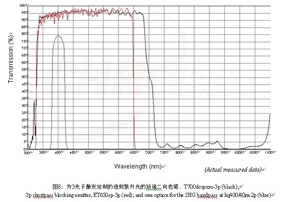為了深入完善濾光片的設(shè)計(jì),許多人想使用二次諧波(SHG)成像和做3光子激發(fā),這些都要求二向色鏡和發(fā)射片能夠透射紫外范圍的光。這可能是設(shè)計(jì)中最困難的一部分,但現(xiàn)已通過干涉技術(shù)來實(shí)現(xiàn)。如圖8。