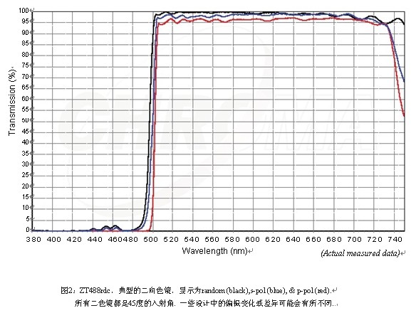 二向色鏡需要考慮的另外一個(gè)因素是激光的偏振。鏡片的設(shè)計(jì)要求在零度入射角下沒有偏振,但是任何一個(gè)鏡片在一定的入射角下都有著起偏器的作用,入射的角度取決于具體的設(shè)計(jì)。因此,所有激光鏡片都需要考慮激光的偏振性質(zhì)。見圖2。