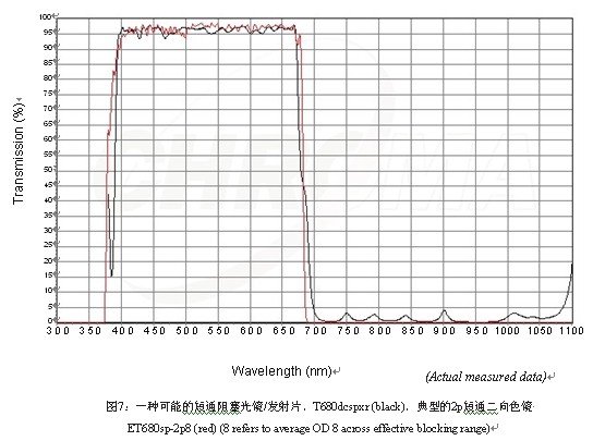 發(fā)展?jié)M足早期的理論參數(shù)的雙光子成像系統(tǒng)(通過使用高功率脈沖激光在兩杯激發(fā)波長處激發(fā)熒光基團(tuán)),對(duì)于濾光片生廠商而言存在很大的技術(shù)難題。對(duì)于這些系統(tǒng),在非掃描模式下,主要的鏡片應(yīng)該是短通設(shè)計(jì)的,即反射長波長的波段而透射短波長的波段。這種鏡片必須被設(shè)計(jì)得反射和透射的效率都相當(dāng)高,并且保證入射的脈沖光線沒有任何的色散,因?yàn)檫@會(huì)明顯降低峰值的功率。這種新技術(shù)也意味著這些系統(tǒng)中的阻塞濾光片對(duì)波長較長的波段有最大化的阻塞效果,而單光子激光顯微鏡恰好相反要在短波有較好的阻塞作用。全新的濾光片設(shè)計(jì)必須是長時(shí)間不斷的研發(fā)和完善以滿足目前要求在全部參數(shù)調(diào)整范圍內(nèi)的激光的阻塞達(dá)到的OD 8+的水平。如下圖7。