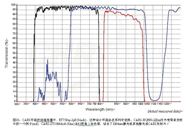 這種新技術(shù),得到了哈佛大學(xué)謝曉亮(SunneyXie)博士的支持,是一種要求有包含多種波長泵浦激光和斯克托斯激光的成熟多光子應(yīng)用。由于這些激光功率巨大,可能還需要另外的阻塞能力,可能要超過上面提到的標(biāo)準(zhǔn)雙光子系統(tǒng)中OD 8+的水平,并且連續(xù)使用兩個(gè)阻塞鏡片的情況也非常普遍。如下圖10。