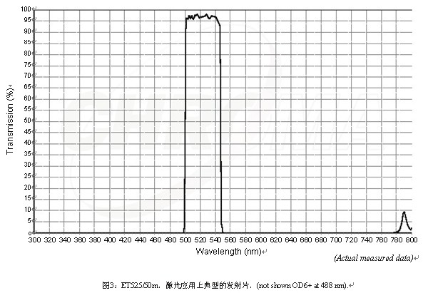 拉曼技術(shù)已經(jīng)存在很多很多年了。目前最常見的是被應(yīng)用在關(guān)于長波激光的正斯克托斯拉曼信號(hào)上(使用長通二向色鏡和長通發(fā)射片)。有時(shí)候,研究者更喜歡看負(fù)的斯克托斯拉曼反應(yīng)(使用短通二向色鏡和帶通或短通發(fā)射片)。每一種應(yīng)用都需要特殊的鏡片或?yàn)V光片,但是主要的要求是盡最大努力阻塞激光,因?yàn)槔盘?hào)非常低。通常拉曼信號(hào)太低,所以光學(xué)鏡片包括純化濾光片和發(fā)射片必須采用熔融石英玻璃而不是浮法玻璃制作,以減少系統(tǒng)中出現(xiàn)的任何的自發(fā)熒光。此外,二向色鏡和發(fā)射片還必須被設(shè)計(jì)得盡量靠近激光束。幸運(yùn)地是,許多正的斯克托斯實(shí)驗(yàn)?zāi)軌蚴褂瞄L通發(fā)射片,這種發(fā)射片更容易設(shè)計(jì)成離激光束只有幾毫微米,并且仍然能獲得最佳的激光過濾效果。如圖11。