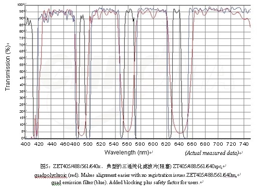 在目前的通過鏡頭取景式的全內(nèi)反射熒光顯微鏡系統(tǒng)中,在立方盒(底座)中或靠近鏡片二色鏡中使用發(fā)射片是非常普遍的,并且在探測(cè)器發(fā)射片轉(zhuǎn)輪前面放置第二個(gè)發(fā)射片。在立方盒中放置一個(gè)好的阻塞發(fā)射片也大大增加了安全系數(shù),以防止某人意外地在沒有激光鎖的情況下向顯微鏡中看過去而受傷。這種雙保險(xiǎn)的發(fā)射設(shè)計(jì)在一些系統(tǒng)下是絕對(duì)有必要的,但在另外的系統(tǒng)中就不一定。這里需要說明的是標(biāo)準(zhǔn)的非常窄的凹口濾光片在這些應(yīng)用中效果不是非常好,因?yàn)檫@種類型的濾光片對(duì)入射光的角度非常敏感。如下圖5和圖6。