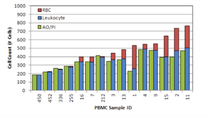 RBC污染極大的影響PBMC樣品的濃度和活性的精確性,RBC污染的程度在不同病人之間有差異,標(biāo)準(zhǔn)的PBMC處理protocol無法區(qū)分,只有AOPI雙熒光自動(dòng)細(xì)胞計(jì)數(shù)儀能夠快速、高效、精確進(jìn)行PBMC計(jì)數(shù)和活力分析,有助于免疫學(xué)的研究。