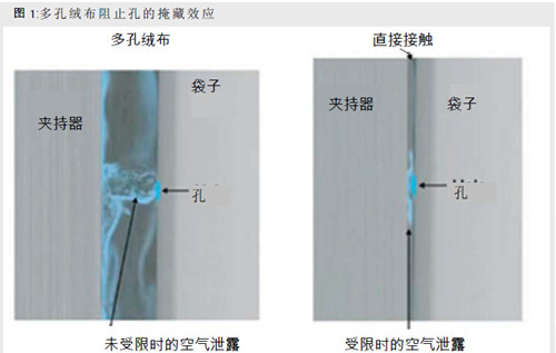 任何測(cè)試方法的目標(biāo)都必須是能夠可靠地證明所安裝的生物反應(yīng)器袋子的罩袋密封圈、端口焊接、連接以及所有袋子表面的潛在泄漏風(fēng)險(xiǎn)。任何泄漏風(fēng)險(xiǎn)都可能導(dǎo)致生物反應(yīng)器內(nèi)部物質(zhì)的損失,或引發(fā)生物安全威脅。在早期基于壓力衰減的一個(gè)方法的開發(fā)過程中,我們證明了當(dāng)擠壓光滑、堅(jiān)硬的塑料袋表面時(shí),其泄露情況能夠完全被掩蓋。極少的測(cè)試氣體可從泄露處跑出,導(dǎo)致壓力衰減檢測(cè)的可靠性為零。因此,對(duì)安裝于夾持器上的袋子,或者甚至在沒有任何多孔墊片將袋子與平板表面隔離開的情況下,對(duì)兩塊支撐板之間隨意放置的袋子進(jìn)行壓力衰減或流量測(cè)定,都將無法代表一個(gè)可靠的測(cè)試安裝方式,就是由于存在著掩蓋效應(yīng)。