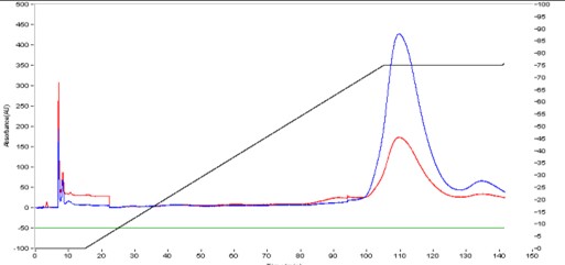 制備用的是利穗雙泵中壓系統(tǒng),特點是,能夠在洗脫出峰的時刻,保持這一刻的A,B流動相比例,(如圖中100分鐘以后的黑線即為在出峰時,保持這一等度,分離出了前后雜)