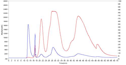 從圖上可以看出,在紫外檢測系統(tǒng)下可以清晰得看到樣品的出峰情況,并且可以根據(jù)出峰情況進行實時收集,點板確認。通過點板后可以確認24min-37min和42min-56min時 間段出現(xiàn)的兩個峰樣品中需要的兩個組分。