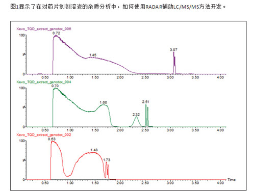 RADAR功能之所以可以實現(xiàn),是建立在Xevo TQD在MS、MS/MS、正離子與負(fù)離子模式超快 的切換速度且不會影響性能的基礎(chǔ)之上的。 使用RADAR輔助LC/MS/MS方法開發(fā),以對加標(biāo) 藥片溶液中的雜質(zhì)進(jìn)行分析。利用最終所開 發(fā)的方法來驗證這套液質(zhì)系統(tǒng)對基因毒性雜 質(zhì)檢測的線性和靈敏度