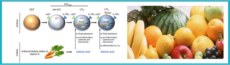 研究人員發(fā)現(xiàn)視黃酸影響這些誘導(dǎo)細(xì)胞的分化。他們喂食懷孕小鼠富含視黃酸的食物,發(fā)現(xiàn)胚胎中LTi4與ILC4neg的比值發(fā)生了增長。而抑制視黃酸信號通路的抑制劑則具有相反的作用。視黃酸受體突變的胚胎比正常組的誘導(dǎo)細(xì)胞少。因此研究人員推測維生素A對這些LTi4細(xì)胞的分化很重要。
