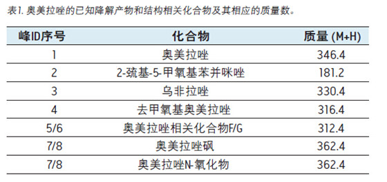 將樣品注入配有2998 PDA檢測器和ACQUITY QDa質(zhì)譜檢測器的Alliancee2695 HPLC系統(tǒng)中。在文獻(xiàn)記錄和美國藥典標(biāo)準(zhǔn)品參考文獻(xiàn)中查到,奧美拉唑至少有八種已知降解化合物2,3,4。表1列出了這些化合物及對應(yīng)的質(zhì)量數(shù)。此分離中存在兩組同分異構(gòu)體。相關(guān)化合物F和G的質(zhì)量數(shù)相同(m/z 312.36),奧美拉唑N-氧化物與奧美拉唑砜的質(zhì)量數(shù)相同(362.42)。圖1給出了酸性降解樣品在CORTECSC18+, 2.7 μm, 4.6 x150 mm色譜柱上的分離結(jié)果。