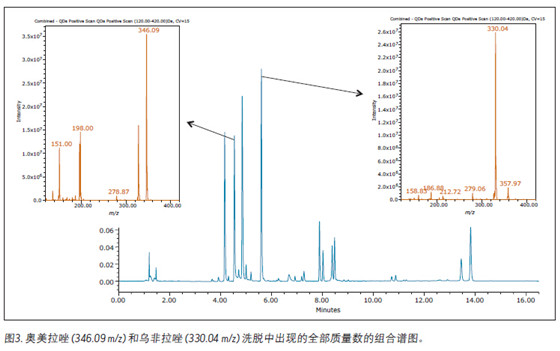 提取離子色譜圖(EIC)用于確認(rèn)峰識別。圖2顯示了以奧美拉唑和2-巰基-5-甲氧基苯并咪唑為例的EIC。ACQUITY QDa檢測器還能夠針對指定峰生成相應(yīng)的質(zhì)譜圖。圖3顯示了奧美拉唑與烏非拉唑的紫外質(zhì)譜圖。紫外質(zhì)譜圖譜分析通常用于確認(rèn)色譜峰識別以及檢測其它化合物的共洗脫。