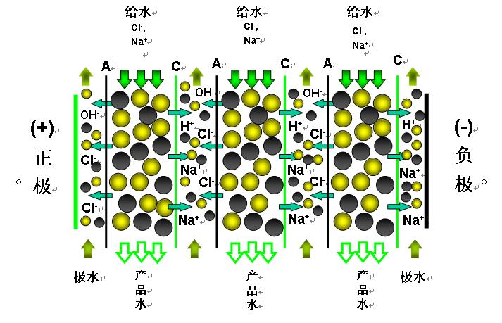 EDI是利用混和離子交換樹脂吸附給水中的陰陽離子,同時這些被吸附的離子又在直流電壓的作用下,分別透過陰陽離子交換膜而被去除的過程(見圖1)。此過程離子交換樹脂不需要用酸和堿再生。