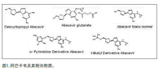 下述應(yīng)用紀(jì)要展示了針對(duì)阿巴卡韋相關(guān)化合物的典型HPLC梯度方法進(jìn)行適當(dāng)?shù)姆椒ㄞD(zhuǎn)換。阿巴卡韋(Ziagen®)是一種核苷類逆轉(zhuǎn)錄酶抑制劑,被用于抗HIV的治療。該樣品由五種化合物組成,其中四種為主要成分阿巴卡韋的相關(guān)物質(zhì),如圖1所示。此類檢測(cè)常用的色譜柱為全多孔C18, 5 μm, 4.6 x 150 mm色譜柱。通過(guò)轉(zhuǎn)換為CORTECS C18, 2.7 μm色譜柱,可大大縮短該梯度方法的分析時(shí)間,同時(shí)還能保持目標(biāo)峰的選擇性和分離度。