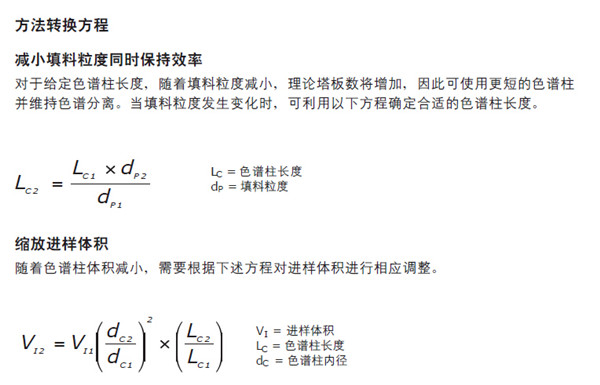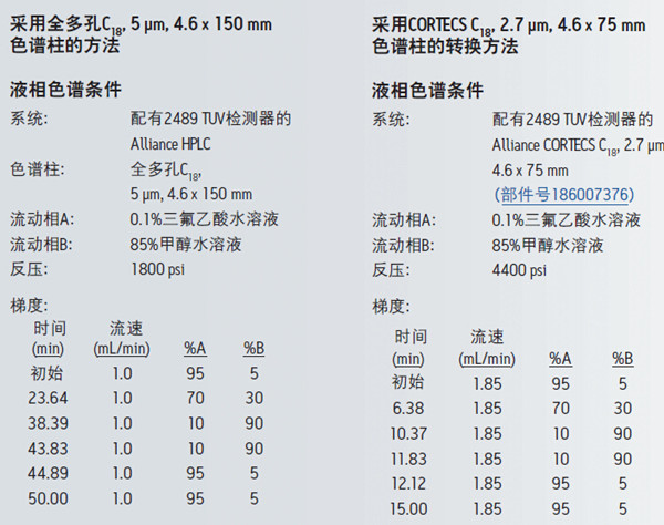 將使用填充了大顆粒的大體積色譜柱的HPLC梯度方法轉(zhuǎn)換至填充高效CORTECS 2.7 μm顆粒的小體積色譜柱,可輕松縮短分析時(shí)間、節(jié)省溶劑與樣品消耗量,最終節(jié)約成本。在轉(zhuǎn)換HPLC梯度方法時(shí),可通過(guò)適當(dāng)調(diào)整方法條件和選擇相當(dāng)?shù)纳V柱填料來(lái)避免對(duì)色譜分離性能的影響。