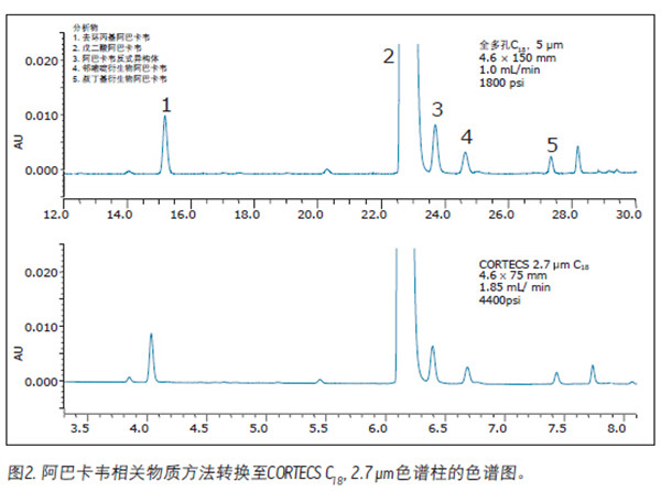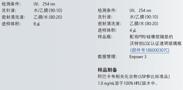 可輕松將使用填充大顆粒的大體積色譜柱的HPLC梯度方法轉(zhuǎn)換至填充高效CORTECS顆粒的小體積色譜柱。本應(yīng)用紀(jì)要介紹對(duì)阿巴卡韋相關(guān)物質(zhì)的典型HPLC梯度方法的進(jìn)行成功轉(zhuǎn)換,其通量增加了約四倍,同時(shí)保持了色譜分離性能。除了節(jié)省了時(shí)間外,溶劑消耗量還降低了約兩倍。當(dāng)采用CORTECS C18, 2.7 μm, 4.6 x 75 mm色譜柱時(shí),