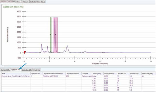 由于大體積的強溶劑進(jìn)樣會使制備級色譜圖失真,因此需要利用旋轉(zhuǎn)蒸發(fā)儀將粗提取物中的甲醇蒸干,使粗提取物成為膠狀。將殘余物溶于14 mL 95:5的水/乙腈溶液中。利用ChromScope軟件中集成的Prep Calculator(制備計算器)工具,將流速與進(jìn)樣體積從分析柱幾何放大至制備柱,所得制備級色譜圖如圖2所示。實驗所用梯度方法將與色譜圖一同顯示,位于進(jìn)樣信息選項卡中。此外,用戶還可以查看餾分收集信息,無需再搜索試管收集體積(圖3)。