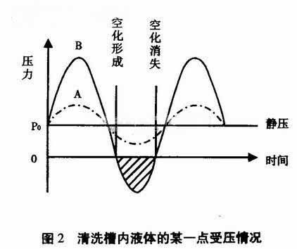 以靜壓(一般一個大氣壓)為中心,產(chǎn)生壓力的增減,若依次增強超聲波的強度,則壓力振幅也隨著增加,像圖2曲線B 所示。通過超聲波發(fā)生器將高于20KHz頻率的有震蕩信號進行電功率放大后經(jīng)超聲波換能器(震頭)的逆壓電效應轉(zhuǎn)換成高頻機械振動能量,通過清洗介質(zhì)中的聲輻射,使清洗液分子振動并產(chǎn)生無數(shù)微小氣泡。氣泡沿超聲傳播方向在負壓區(qū)形成、生長,并在正壓區(qū)迅速閉合而產(chǎn)生上千個大氣壓的瞬間高壓而爆破,形成無數(shù)微觀高壓沖擊波作用于被清洗工件表面。此即超聲波清洗中的“空化效應”。超聲波清洗機就是基于“空化效應”的基本原理工作的。