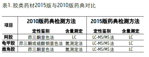 膠、鹿角膠三種膠類藥材。無論何種皮類,經(jīng)水解后其膠原蛋白均變成分子量更小的肽類,從而失去原有膠原蛋白的性質(zhì),無法進(jìn)行來源鑒別。2015版藥典對阿膠、龜甲膠、鹿角膠的定性方法進(jìn)行修正,采用液質(zhì)聯(lián)用的方法檢測特征性肽段,方法更科學(xué)可靠;同時(shí)對龜甲膠和鹿角膠的定量分析方法也進(jìn)行了修改,從以前的氮測定法修改為液相色譜法。