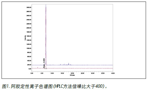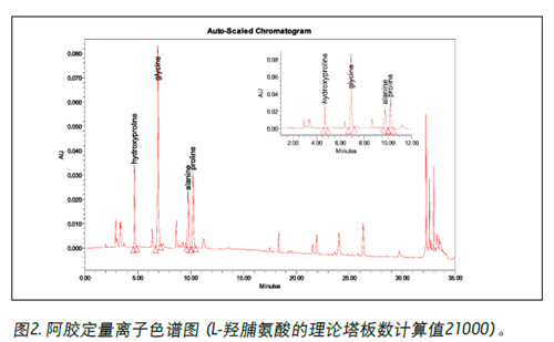 沃特世(Waters®)針對這一變化開發(fā)了穩(wěn)定、快速、靈敏的LC-MS/MS方法,進(jìn)行定性鑒別; 同時(shí)重現(xiàn)了龜甲膠和鹿角膠LC的含量測定方法。HPLC及UPLC®方案定性結(jié)果顯示:阿膠、龜甲膠、鹿角膠的信噪比大于100,其中龜甲膠的 631.3 > 546.4通道信噪比大于38000,完全滿足2015版藥典信噪比3:1的要求(圖1為阿膠定性離子色譜圖);定量測定結(jié)果表明:L-羥脯氨酸,甘氨酸,丙氨酸,L-脯氨酸衍生物分離度均大于1.5,同時(shí)按L-羥脯氨酸計(jì)算,理論塔板數(shù)大于21000,遠(yuǎn)遠(yuǎn)大于藥典規(guī)定值。(圖2為阿膠定量離子色譜圖)。