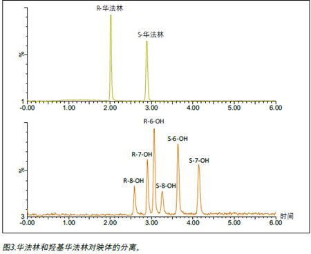 UPC2與MS聯(lián)用有利于母體化合物和三種羥基代謝物的對映體分離。華法林、6-羥基華法林、7-羥基華法林和8-羥基華法林對映體在5 min內(nèi)成功分離,普萘洛爾、4-羥基普萘洛爾、5-羥基普萘洛爾和7-羥基普萘洛爾在15 min內(nèi)成功