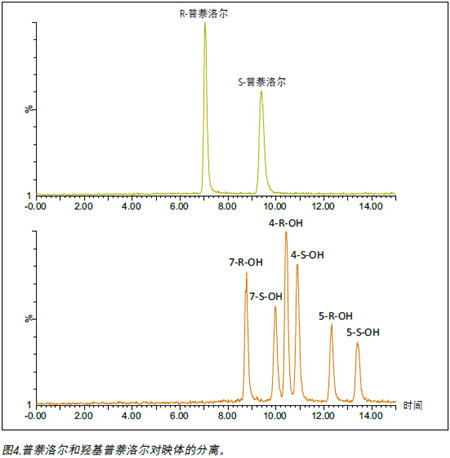 3.0×150 mm色譜柱,以甲酸銨改性的甲醇作為共溶劑對普萘洛爾進行了分離。在本例中,通過使用線性梯度并將柱溫保持在30 ℃,六種構(gòu)型的羥基普萘洛爾在14 min內(nèi)成功實現(xiàn)分離。