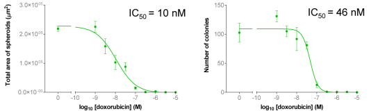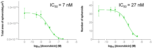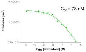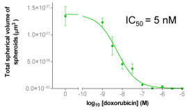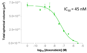 Figure 3A:生長在384孔超低粘附板中的HepG2腫瘤微球體的全孔TIFF圖像,圖像底部顯示了加入每孔的阿霉素濃度。3B-C:藥物量效曲線(mean±SEM,n=8) |