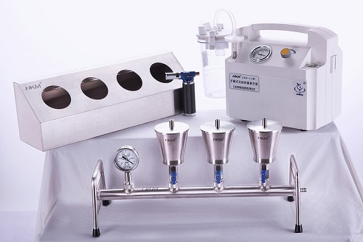 (6)使用方法:在濾頭上放上水系濾膜把不銹鋼濾杯與濾頭通過卡箍固定在一起,氣嘴與真空動力相連,打開各個碟閥,把溶液注入濾杯,打開真空動力,溶液通過濾頭上的濾膜在動力作用下溶液迅速通過過濾支架流入集液室,待濾杯中溶液全部流入集液室,只須取下待分析濾膜即可。