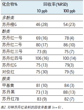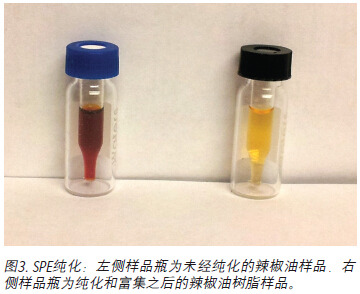 結果見表2。本研究中測定的蘇丹紅染料包括酚類(如蘇丹紅一號)、多酚類(如蘇丹橙G)和胺類(如蘇丹黑)。由于Sep-Pak硅膠小柱能有效保留10種目標分析物染料,因此被選用于SPE純化。雖然回收率一般在75%至100%之間,但多酚類蘇丹橙G的回收率只有約50%。與其它染料相比,此化合物在硅膠SPE小柱上的保留性更強。通過增加洗脫體積或提高洗脫溶劑中乙腈的百分含量可提高回收率。然而,這些步驟都會使最終萃取物中深色基質化合物含量變多,從而使純化效果明顯變差。圖3展示了獲得的純化樣品,左側樣品瓶中為SPE處理前從溶于己烷的1.0 mL樣品中取出的一份150 μL樣品,右側樣品瓶中為SPE處理后復溶于150 μL甲醇的樣品。SPE方案不僅顯著提升了萃取物的純凈度,還將萃取物濃縮了將近7倍。