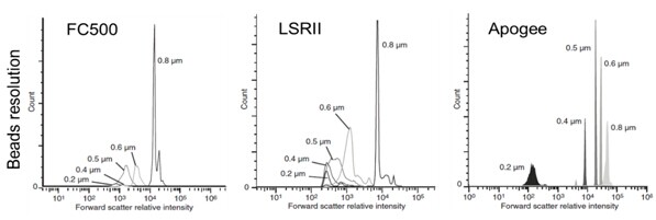 Fig. 2. Size resolvability of different flow cytometers using polystyrene microspheres. Graphs show forward scatter relative intensity for 0.2 - 0.8μm polystyrene microspheres for three flow cytometers. | ||||
