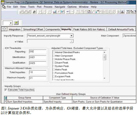 定量分析。首先,我們在Empower處理方法中指定了計算雜質(zhì)數(shù)量或雜質(zhì)響應(yīng)的公式(圖1)。接下來,我們定義了對雜質(zhì)進行報告、鑒定和定性的ICH閾值。然后,為總雜質(zhì)和最大雜質(zhì)指定了最大允許值。在本例中,我們采用了比ICH指導(dǎo)原則更嚴格的標準,以展示鑒定和標記超出雜質(zhì)閾值限制的色譜峰的工作流程。我們采用的報告閾值為0.02%API,該值低于ICH指導(dǎo)原則中規(guī)定的新藥物產(chǎn)品中的報告雜質(zhì)值0.1%(基于最大每日劑量≤1g)2。此外,我們可以為藥物產(chǎn)品的每種指定雜質(zhì)選擇比一般ICH閾值更嚴的限值。另外,我們還能對特定類型的雜質(zhì)進行分組,以計算其總量。