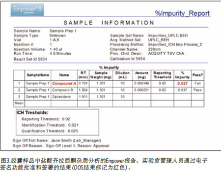 最后,通過處理色譜數(shù)據(jù)以確定雜質(zhì)總量。數(shù)據(jù)(圖2A)顯示,使用Empower專利的峰檢測ApexTrack™積分算法在膠囊樣品中檢測到化合物A和B兩種雜質(zhì)。Empower軟件快速鑒別出了化合物A的超標(OOS)結(jié)果(標記為紅色),因為該值超出了處理方法中定義的閾值限制(圖2B)。此外,還可輕松報告雜質(zhì)的分析結(jié)果(圖3)。報告模版可自定義設(shè)置以滿足每個用戶的報告需求,可以方便地使用電子簽名功能,如圖3所示。