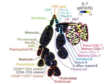 圖三、利用CyTOF對骨髓的信號通路分析(SPADE分析)