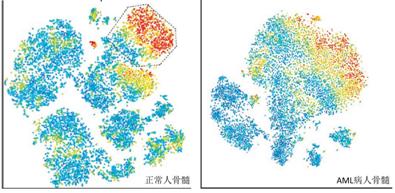 圖六、利用CyTOF對正常人和AML病人骨髓的對比圖譜(分析方法:viSNE)