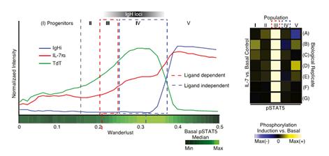 CyTOF數(shù)據(jù)能幫助其找出正確的細(xì)胞群,這使Bendall能夠進(jìn)一步進(jìn)行基因組分析,以此證明B細(xì)胞的基因組重排是隨著細(xì)胞發(fā)育過程而增加的。這不僅僅是一個發(fā)現(xiàn)——它成了一個全新的策略。它給了Bendall一個新的工作流程,這就是以這種分階段的方法將基因組學(xué)和蛋白質(zhì)組學(xué)結(jié)合起來,并在最后清晰的提煉出他的結(jié)論。