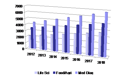 PCR 市場分為三個領(lǐng)域:生命科學(xué)研究,食品和農(nóng)業(yè),醫(yī)療診斷。 生命科學(xué)研究市場增長迅速。有調(diào)查顯示PCR市場全球有8%的增長趨勢。