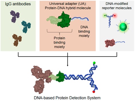 Figure 1. (Middle) UA, a bifunctional protein−DNA hybrid molecule, which binds to most types of IgG antibodies (left) and any DNAmodified reporter molecules (right) to generate a modular library of pre-labeled primary IgG antibodies for any applications of protein detection in place of secondary antibodies.