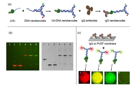 (a) Scheme to confirm the binding of UA against DNA nanobarcodes and IgG primary antibodies. DNA linker of UA was hybridized with DNA nanobarcodes to form UA-DNA nanobarcodes. UA-DNA nanobarcodes bound to IgG antibodies to form IgG nanobarcodes. (b) Characterizing of the hybridization of UA and DNA nanobarcodes on native PAGE gel electrophoresis. The same gel with no staining (left) showed signals of distinct color ratios from DNA nanobarcodes, and with GelRed nucleic acid stain (right) showed signals from all DNA products. Lane 1. UA; Lane 2. R2G0-DNA nanobarcode; Lane 3. EZZ protein mixed with R2G0-DNA nanobarcode; Lanes 4-6. UA hybridized with R2G0-, R1G1-, and R0G2-DNA nanobarcodes, respectively. The shifted bands in lanes 4-6 showed that DNA nanobarcodes were linked to UA through DNA hybridization. (c) Characterizations of the binding of UA-DNA nanobarcodes to IgG antibodies using dot blot technique. Different IgG antibodies were spotted on PVDF membrane and incubated with the UA-DNA nanobarcodes. Dots 1-3. Rabbit polyclonal antibodies (anti-glucagon, anti-PDX-1, and anti-insulin) labelled with R2G0-, R1G1-, and R0G2-nanobarcodes, respectively. Fluorescence signals detected from dots 1-3 showed strong binding between the IgG antibodies and EZZ protein of UA. Dot 4. Goat polyclonal antibody (anti-PDX-1) labelled with R1G1-nanobarcode. When using a non-specific IgG that cannot bind with EZZ protein, there was no fluorescence signal detected from dot 4. Dot diameters were 250 Km for all images.